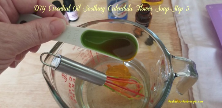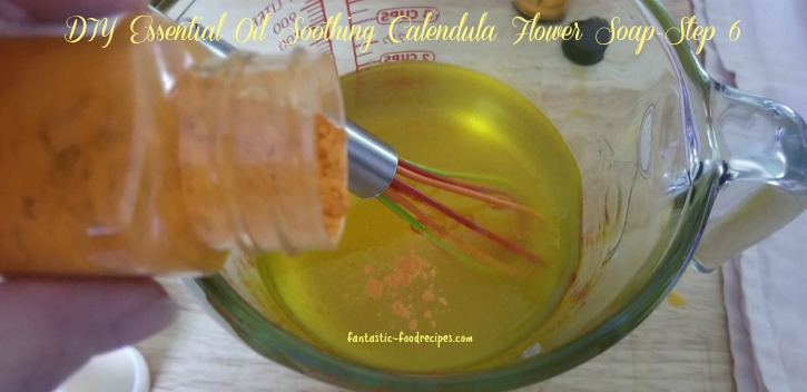 Step 3: Then add the Calendula oil. This oil has been shown to have numerous benefits for your skin. It has antiseptic and antimicrobial properties that can help speed up healing of wounds and minor cuts. It works great on eczema and other skin conditions. It also has been shown to relieve on acne, insect bites and bed sores.