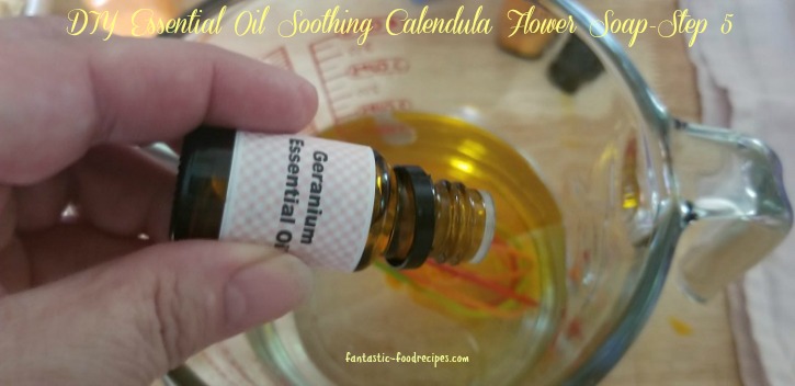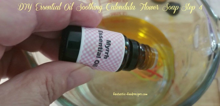- Steps 1-2: Melt soap base in microwavable bowl for 30 second intervals until melted completely. Then add the jojoba oil to the melted soap base. Step 3: Then add the Calendula oil. This oil has been shown to have numerous benefits for your skin. It has antiseptic and antimicrobial properties that can help speed up healing of wounds and minor cuts. It works great on eczema and other skin conditions. It also has been shown to relieve on acne, insect bites and bed sores. Step 4: Add myrrh essential oil. This oil has been shown to treat reduce inflammation, speed up healing, and fight infections. Step 5: Add geranium essential oil. This oil is a natural antiseptic with anti-fungal, antiviral, anti-inflammatory and antibacterial properties. It can also calm irritated skin and fight infections. Step 6: Add color if you like. Step 7: Whisk ingredients together. Step 8: Spray mold with rubbing alcohol. Step 9: Add Calendula flowers to bottom of the mold. Steps 10-12: Pour soap mixture into mold, sprinkle more flowers on the top and spray mold with rubbing alcohol. Step 13: Allow to harden for at least two hours and gently pop out of mold. I recommend storing in a plastic bag or a container with a lid.
