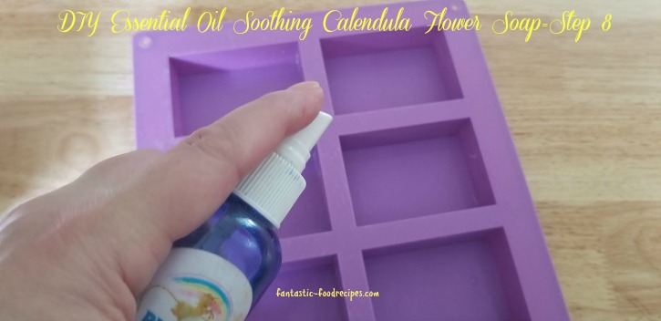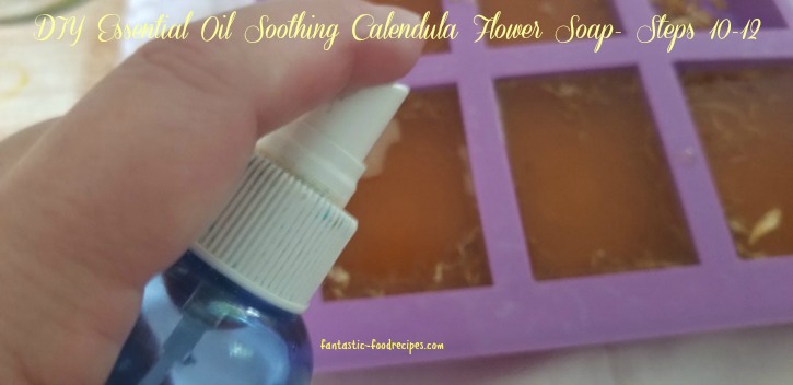 Steps 10-12: Pour soap mixture into mold, sprinkle more flowers on the top and spray mold with rubbing alcohol.